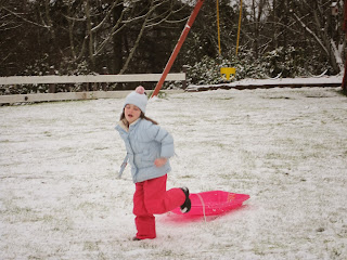 Lia anxiously awaiting her first sled ride through the yard (she informed me that I was the horse that would pull her--lucky me).