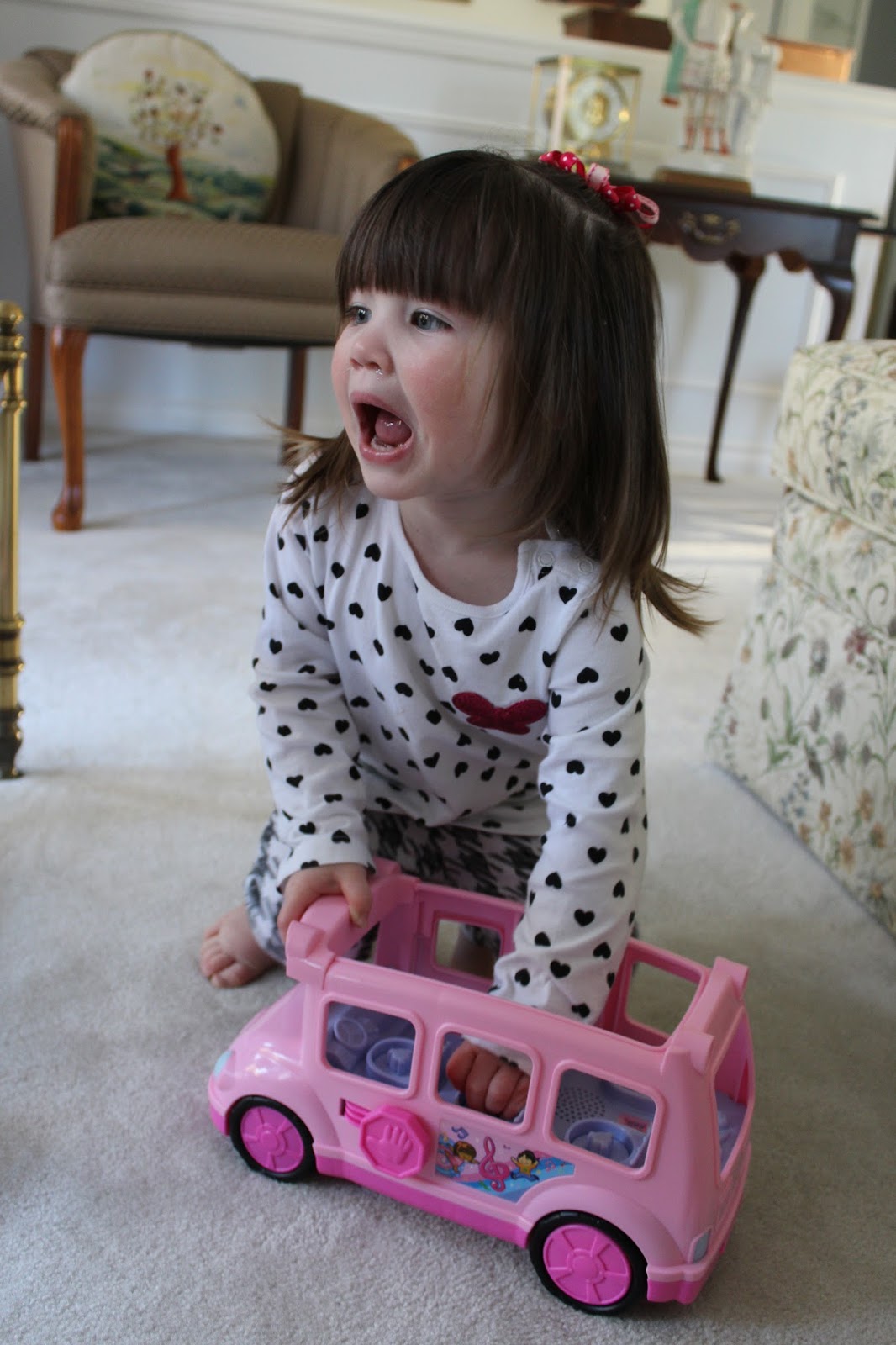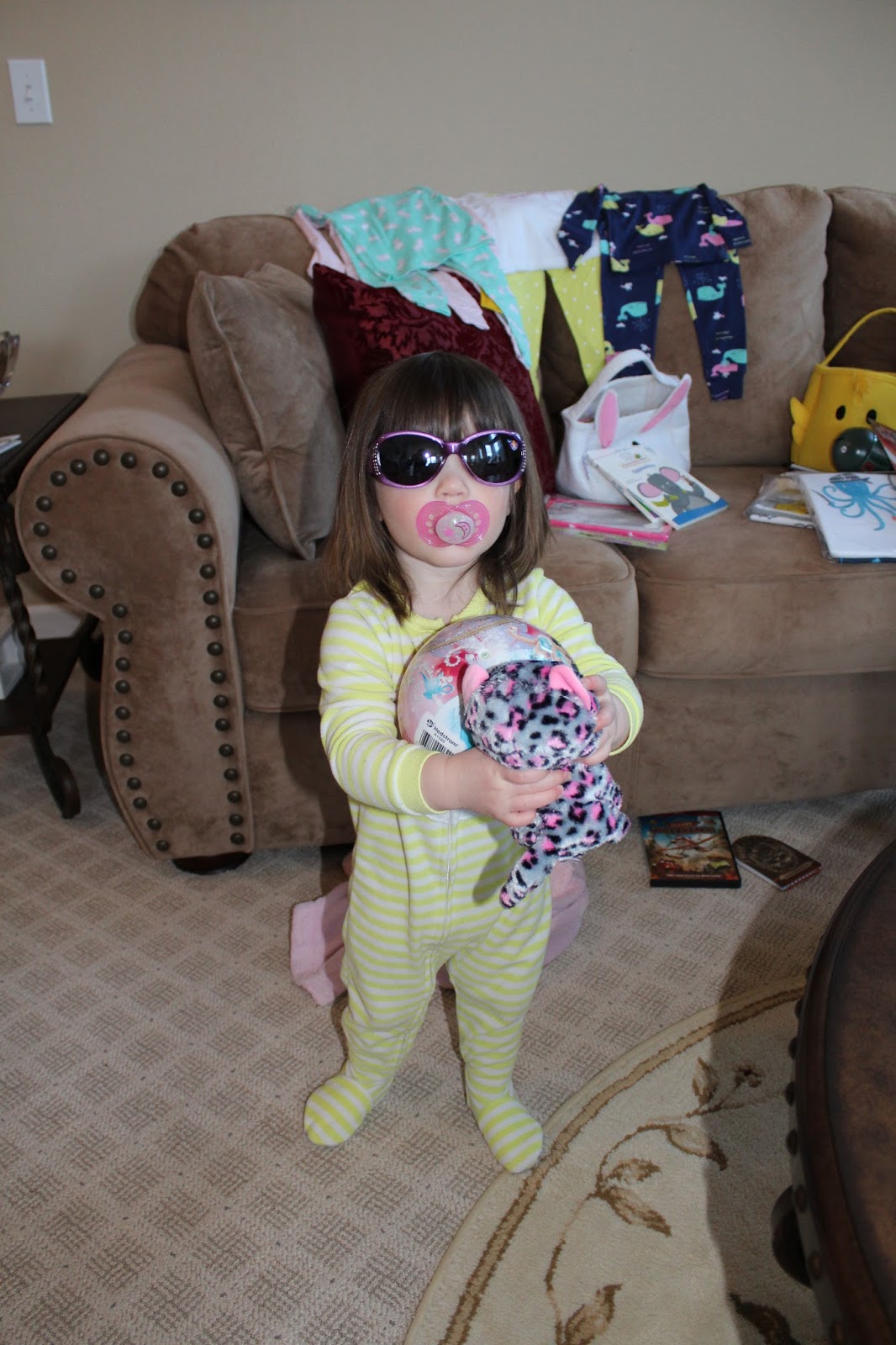 Ella was hilarious and immediately put on her sunglasses and grabbed her ball and Beanie Boo animal. Here she is all ready to go!