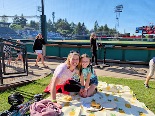 It has been a tradition for years at Ella's gym to host an end-of-the-year celebration for their competitive team at a Rainier's baseball game at Cheney Stadium in Tacoma. Since this was Ella's first year on the team, we had no idea what to expect, but it turned out to be such a fun evening. The team rents out a private area with our own viewing deck and playground and provides a catered dinner. Since it's an outside venue, we were so fortunate to have incredible weather with beautiful, blue skies and temperatures in the 70s. I checked Ella (and Logan) out of school 30 minutes early, so we had enough time to get home and get ready to leave by 4 p.m. We arrived at the stadium at 4:30 and had the place to ourselves for an hour or so. This allowed the gym to put on a little program recognizing each level of their competitive team and also to honor the graduating seniors. While this was going on, a slideshow was playing on the stadium's jumbotron screen with pictures that all of the parents had submitted in advance. It was so cool to see pictures of Ella up on a huge screen at a professional baseball stadium! After the program was over, we enjoyed eating dinner while sitting on blankets on the grass before Ella and the rest of her friends seriously played for the rest of the night. Since Ella and I have absolutely NO interest in baseball, we did not watch a single minute of the game. Instead, I spent the evening talking to various moms who I have become friends with this year while Ella and her gymnast friends bounced back and forth between playing on the playground and eating food on the blankets on the grass. After staying 4.5 hours, we left the game a little early at 9 p.m. to avoid the crazy traffic getting out of the stadium and headed home after a very long and fun evening at the ball park!