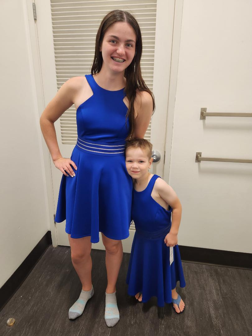 Emmett did such a good job being dragged to two different department stores to watch Lia pick out and try on several dresses. He asked several times if he could try on one, too. After telling him "no" over and over again, I finally gave in when Lia found her dress. Since we already had three sizes in the dressing room of the blue dress she ended up choosing, I let him put on a matching dress. Since we thought that this was so funny, we had to take a picture to capture this moment forever. I thought to myself that it is not every day that a 4-year old boy gets to go Homecoming dress shopping with an older sister!